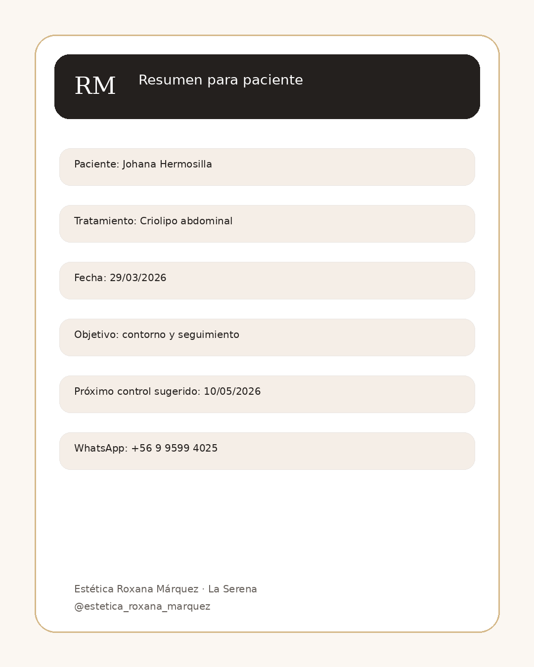 | Johana Hermosilla Criolipo · La Serena | +56 9 7777 1111 | Control pendiente | 2026-02-10 | 2026-05-10 | |